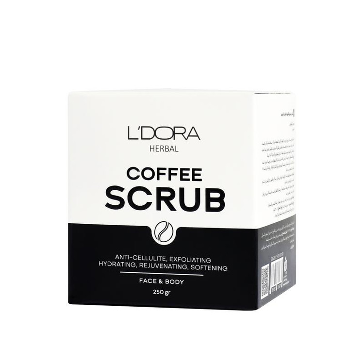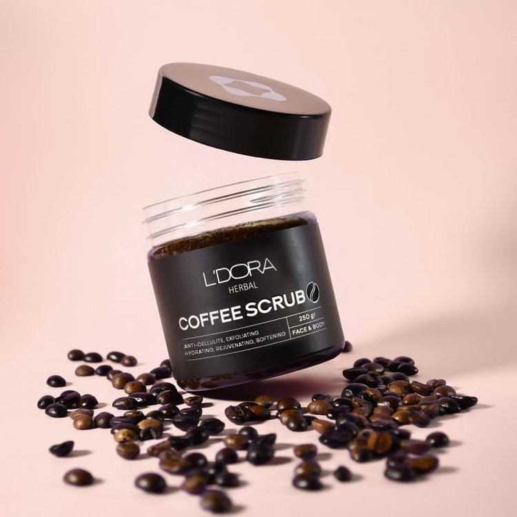 پودر قهوه، شکر سفید، کلاژن گیاهی، روغن بادام شیرین، روغن زیتون، روغن هسته انگور، شیباترمحفظه کاسه ای پلاستیک